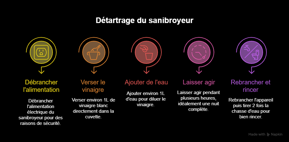 Un détartrage préventif régulier limite ce type de problème. Selon la dureté de l’eau, un traitement une à deux fois par trimestre permet de réduire l’accumulation de calcaire et de préserver les performances du sanibroyeur.