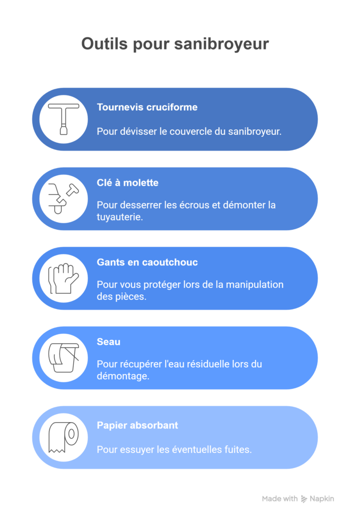 Certaines opérations de maintenance nécessitent un accès aux composants internes du sanibroyeur. Pour cela, quelques outils de base sont généralement suffisants. Un tournevis permet de retirer le couvercle de l’appareil, tandis qu’une clé à molette facilite le démontage de certains éléments de tuyauterie. Le port de gants protège lors de la manipulation des pièces, et l’utilisation d’un récipient permet de récupérer l’eau résiduelle lors des interventions. Des chiffons ou du papier absorbant sont utiles pour nettoyer les surfaces et éviter les écoulements.