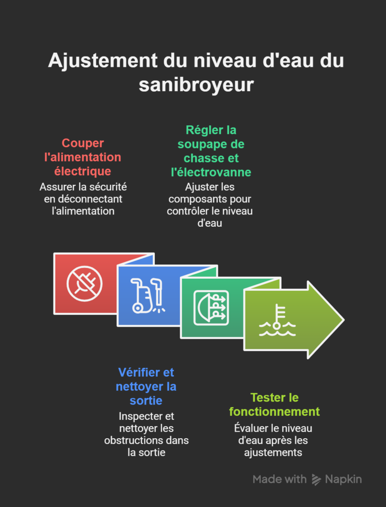 L’ajustement du niveau d’eau d’un sanibroyeur est une opération de maintenance courante, visant à garantir une évacuation correcte et à éviter les débordements ou les dysfonctionnements répétés. Cette intervention repose sur une vérification progressive des éléments électriques, hydrauliques et mécaniques de l’appareil.